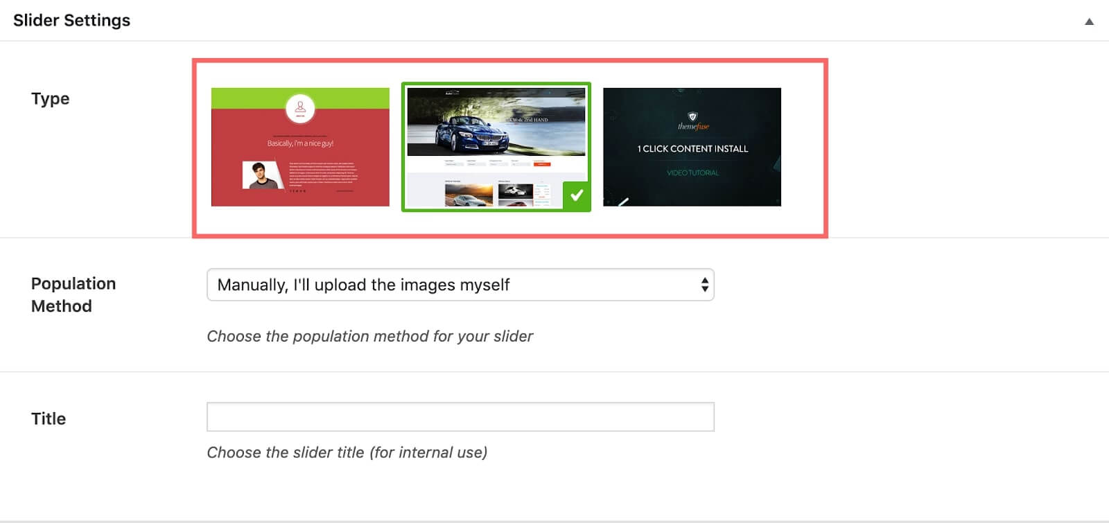 Далее мы попадем на страницу выбора слайдера, по умолчанию от Unyson есть 3 слайдера: